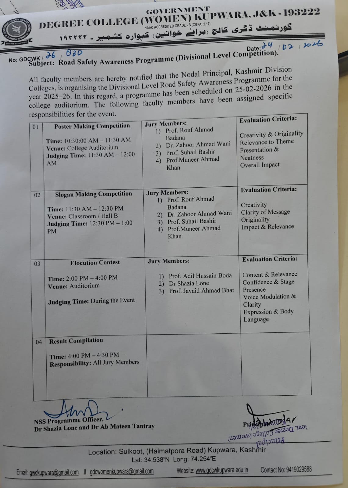 All faculty members are hereby notified that the Nodal Principal, Kashmir Division Colleges, is organising the Divisional Level Road Safety Awareness Programme for the year 2025-26. In this regard, a programme has been scheduled on 25-02-2026 in the college auditorium. The following faculty members have been assigned specific